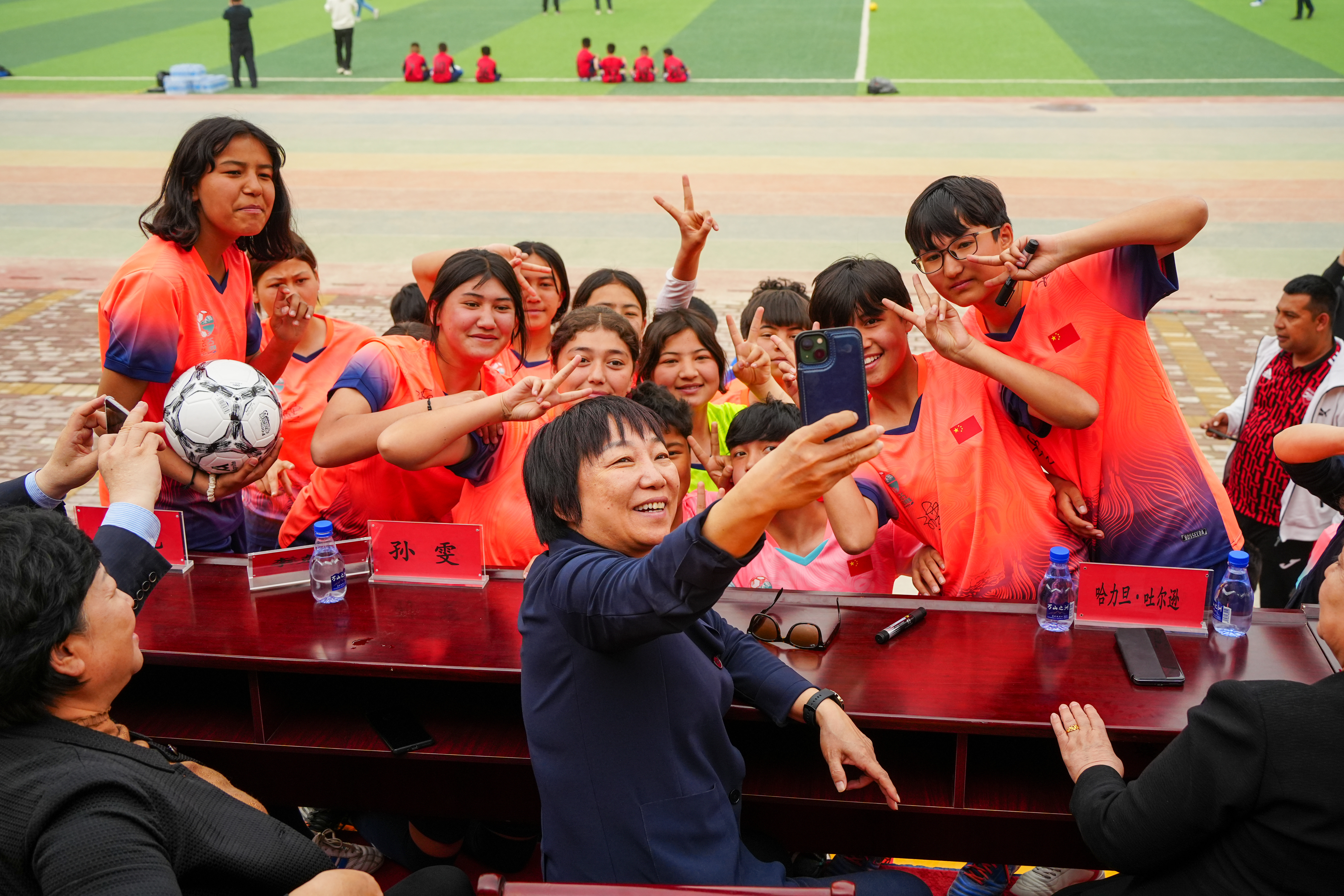 这张图片展示了杨柑镇足球队伍的风采,他们身着统一的球衣,精神抖擞地站在球场上,展现出了杨柑镇足球人的坚韧与拼搏精神“逐梦潮人”实践团与杨柑队伍合影,逐梦潮人摄这...